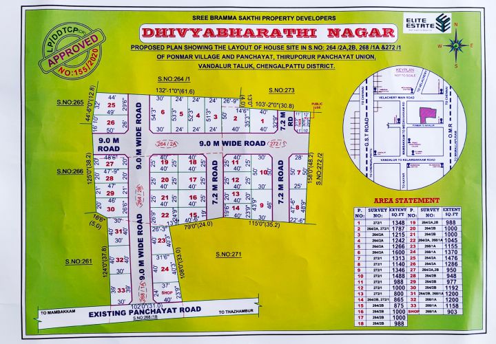 Elite Estate is proudly launching Dhivyabharathi Nagar, DTCP-approved and RERA-approved at Ponmar. Chennai. We offer residential projects in plots and villas with contemporary architecture and features for a comfortable living environment. Quality is a continuous endeavor that focuses on customer satisfaction. We will strive to make a constant effort to maintain and improve our quality commitment at all times. Dhivyabharathi Nagar Is A Natural, Serene Location Where the pollution and Craziness Of The Cities Are Never Heard Of. Natural Spring Water Underneath The Surface And Rich Red Soil Cover The Project is the perfect destination for a relaxed lifestyle. With all these features, it is easy to see why Dhivyabharathi Nagar is a popular choice for a peaceful and tranquil living experience. Dhivyabharathi Nagar offers beautifully landscaped gardens, a luxurious pool, and a range of other amenities. It also provides a variety of activities. Residents can also enjoy the convenience of being close to local shops. Dhivyabharathi Nagar provides a peaceful and beautiful environment for our customers to relax and enjoy. We are committed to offering the highest quality of service and amenities to ensure our customers have the best experience possible.
