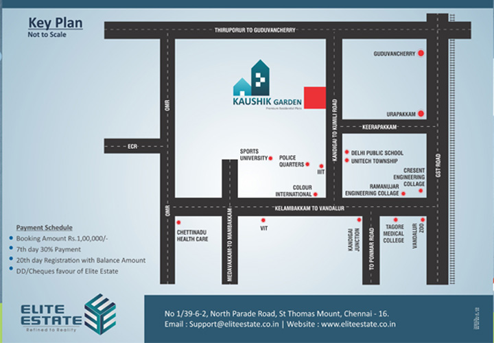 Elite Estate is proudly launching Kaushik Garden, DTCP-approved and RERA-approved at Kandigai. We offer residential projects in plots and villas with contemporary architecture and features for a comfortable living environment. Quality is a continuous endeavor that focuses on customer satisfaction. We will strive to make a constant effort to maintain and improve our quality commitment at all times. Kaushik Garden Is A Natural, Serene Location Where the pollution and Craziness Of The Cities Are Never Heard Of. Natural Spring Water Underneath The Surface And Rich Red Soil Cover The Project is the perfect destination for a relaxed lifestyle. With all these features, it is easy to see why Kaushik Garden is a popular choice for a peaceful and tranquil living experience. Kaushik Garden offers beautifully landscaped gardens, a luxurious pool, and a range of other amenities. It also provides a variety of activities. Residents can also enjoy the convenience of being close to local shops. Kaushik Garden provides a peaceful and beautiful environment for our customers to relax and enjoy. We are committed to offering the highest quality of service and amenities to ensure our customers have the best experience possible.