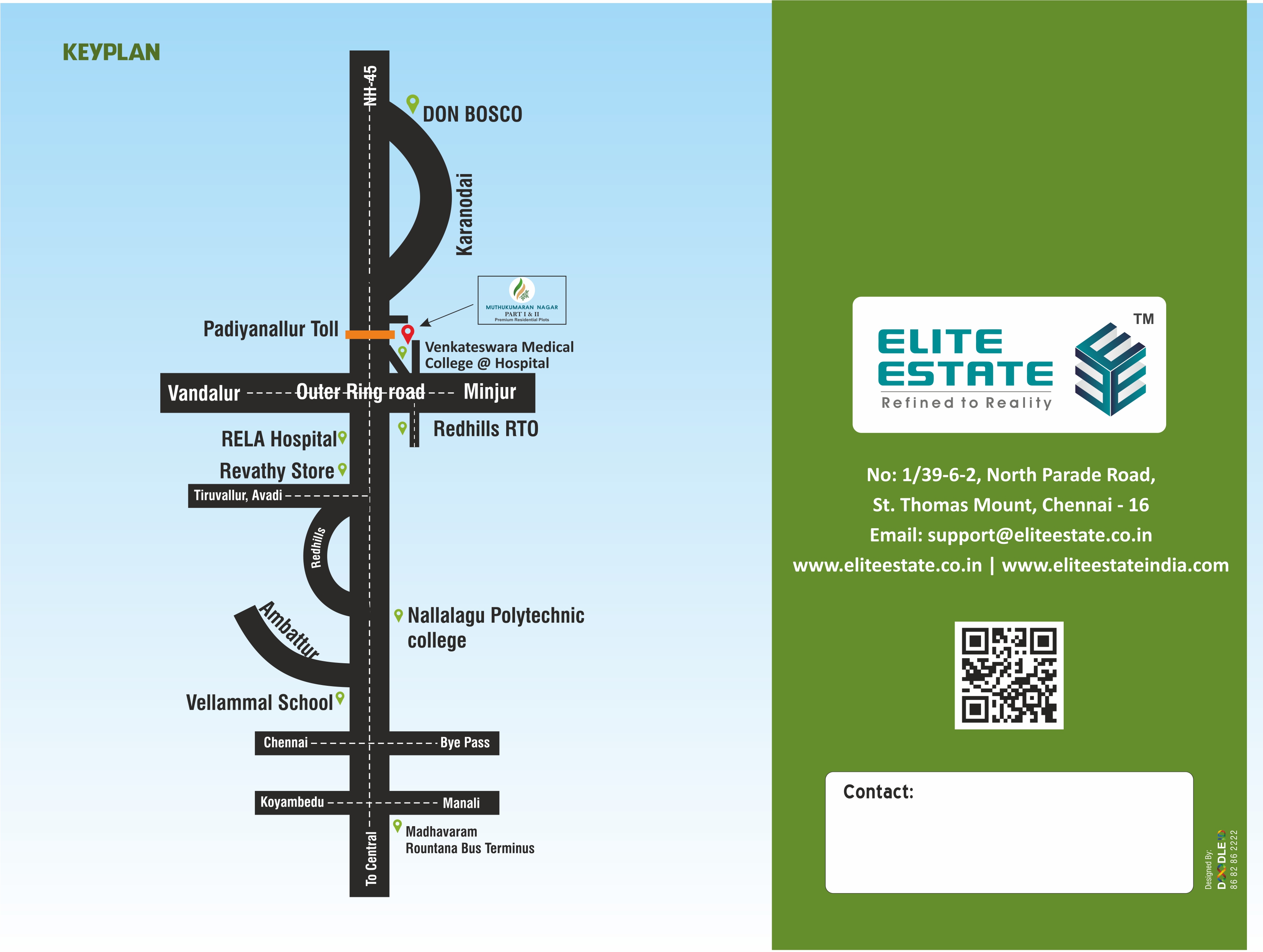 Elite Estate is proudly launching Muthukumaran Nagar, CMDA-approved and RERA-approved at Redhills. We offer residential projects in plots and villas with contemporary architecture and features for a comfortable living environment. Quality is a continuous endeavor that focuses on customer satisfaction. We will strive to make a constant effort to maintain and improve our quality commitment at all times. Muthukumaran Nagar Is A Natural, Serene Location Where the Pollution and Craziness Of The Cities Are Never Heard Of. Natural Spring Water Underneath The Surface And Rich Red Soil Cover The Project is the perfect destination for a relaxed lifestyle. With all these features, it is easy to see why Muthukumaran Nagar is a popular choice for a peaceful and tranquil living experience. Muthukumaran Nagar offers beautifully landscaped gardens, a luxurious pool, and a range of other amenities. It also provides a variety of activities. Residents can also enjoy the convenience of being close to local shops. Muthukumaran Nagar provides a peaceful and beautiful environment for our customers to relax and enjoy. We are committed to offering the highest quality of service and amenities to ensure our customers have the best experience possible.