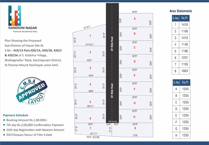 Elite Estate is proudly launching Nandhini Nagar, DTCP-approved and RERA-approved at Kovilambakkam. We offer residential projects in plots and villas with contemporary architecture and features for a comfortable living environment. Quality is a continuous endeavor that focuses on customer satisfaction. We will strive to make a constant effort to maintain and improve our quality commitment at all times. Nandhini Nagar Is A Natural, Serene Location Where the pollution and Craziness Of The Cities Are Never Heard Of. Natural Spring Water Underneath The Surface And Rich Red Soil Cover The Project is the perfect destination for a relaxed lifestyle. With all these features, it is easy to see why Nandhini Nagar is a popular choice for a peaceful and tranquil living experience. Nandhini Nagar offers beautifully landscaped gardens, a luxurious pool, and a range of other amenities. It also provides a variety of activities. Residents can also enjoy the convenience of being close to local shops. Nandhini Nagar provides a peaceful and beautiful environment for our customers to relax and enjoy. We are committed to offering the highest quality of service and amenities to ensure our customers have the best experience possible.