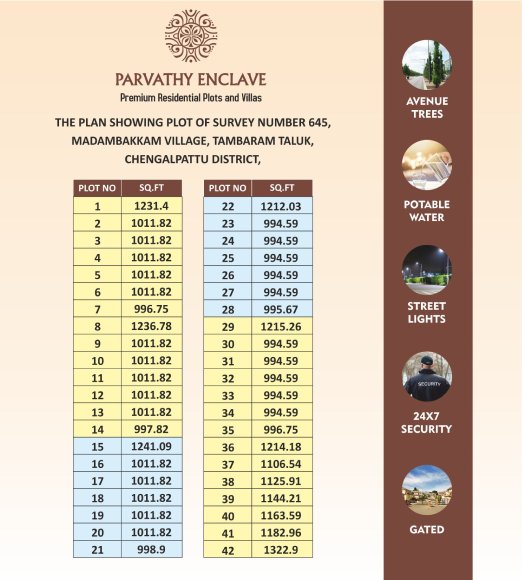 Elite Estate is proudly launching Parvathy Enclave, DTCP-approved and RERA-approved at Madambakkam. We offer residential projects in plots and villas with contemporary architecture and features for a comfortable living environment. Quality is a continuous endeavor that focuses on customer satisfaction. We will strive to make a constant effort to maintain and improve our quality commitment at all times. Parvathy Enclave Is A Natural, Serene Location Where the Pollution and Craziness Of The Cities Are Never Heard Of. Natural Spring Water Underneath The Surface And Rich Red Soil Cover The Project is the perfect destination for a relaxed lifestyle. With all these features, it is easy to see why Parvathy Enclave is a popular choice for a peaceful and tranquil living experience. Parvathy Enclave offers beautifully landscaped gardens, a luxurious pool, and a range of other amenities. It also provides a variety of activities. Residents can also enjoy the convenience of being close to local shops. Parvathy Enclave provides a peaceful and beautiful environment for our customers to relax and enjoy. We are committed to offering the highest quality of service and amenities to ensure our customers have the best experience possible.